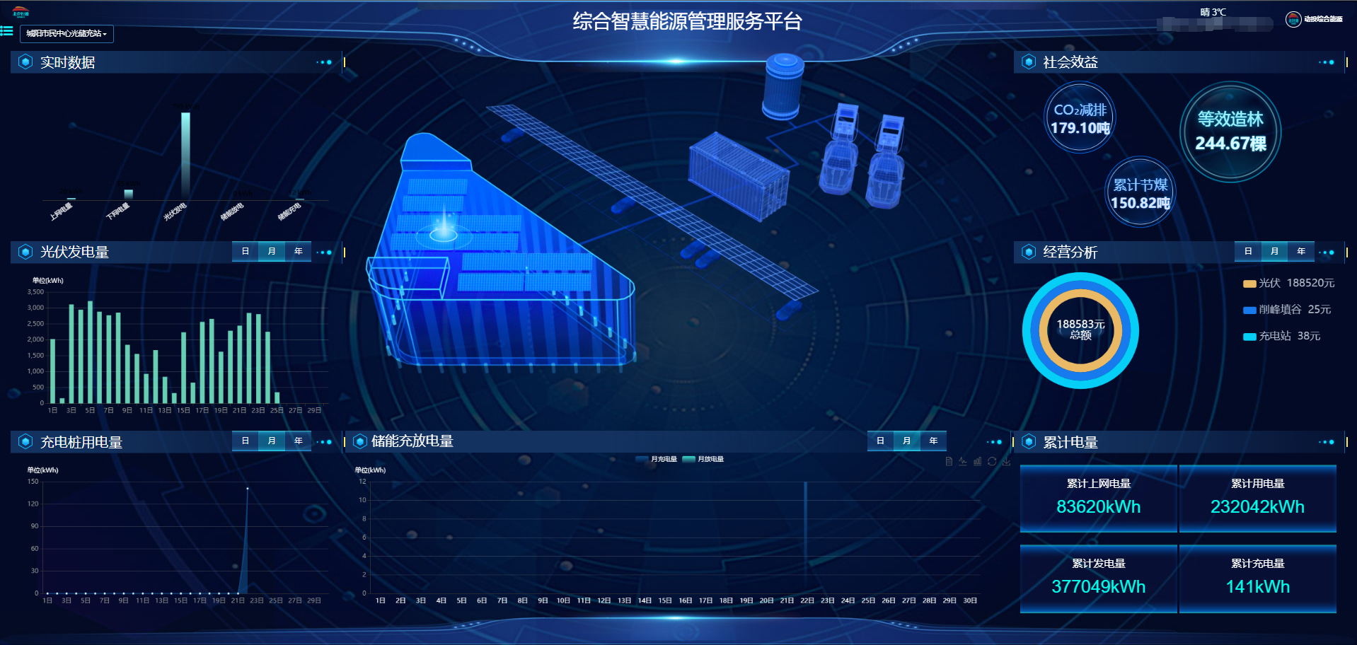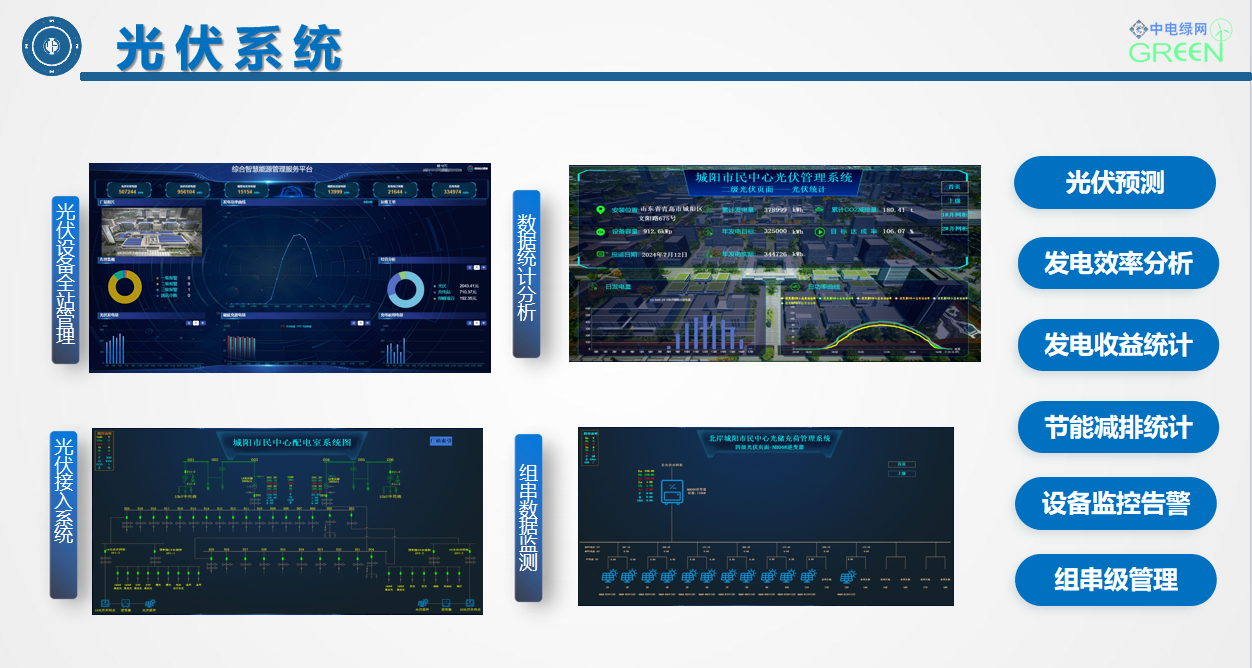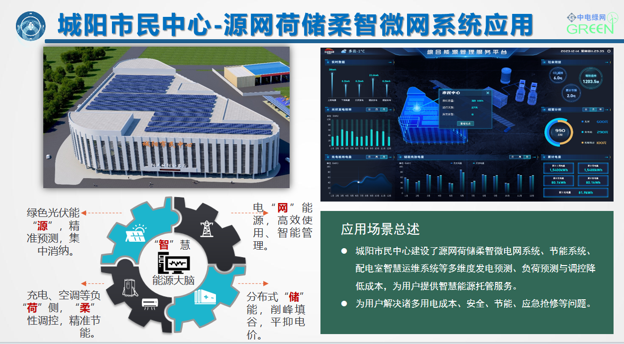 ??? 中電綠網承接、參建的城陽市民中心項目,以打造“源網荷儲柔智”一體化智慧能源系統為核心目標,集成整合“光伏發電、儲能、充電樁、智能配電及多種能源協調控制”等核心技術,在提供綠色能源的同時,借助儲能實現電力削峰填谷等輔助服務;通過智慧能源大腦對多能流進行綜合調控,可大幅提高整個能源供給與消納系統的運行效率。為用戶在成本收益管理方面,提供了精細化收益管理,實現光儲充荷收益綜合管理。
