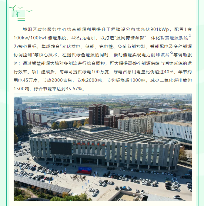 ?? ?城陽區政務服務中心綜合能源利用提升工程建設分布式光伏901kWp,配置1套100kw/100kwh儲能系統,48臺充電樁,以打造“源網荷儲柔智”一體化智慧能源系統為核心目標,集成整合“光伏發電、儲能、充電樁、負荷節能控制、智能配電及多種能源協調控制”等核心技術,在提供綠色能源的同時,借助儲能實現電力削峰填谷等輔助服務;通過智慧能源大腦對多能流進行綜合調控,可大幅提高整個能源供給與消納系統的運行效率。項目建成后,每年可提供綠電100萬度,綠電占總用電量比例超過40%,年節約用電45萬度,節熱2000吉焦,節水2000噸,節約標煤超1000噸,減少二氧化碳排放約1500噸,綜合節能率達到35.67%。